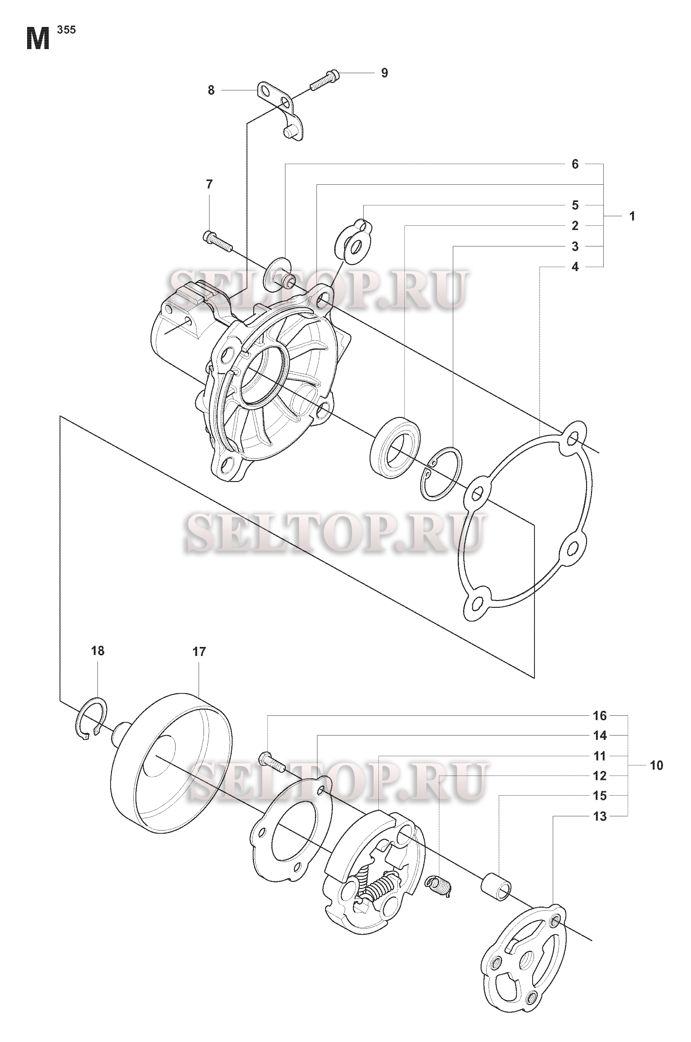 Сцепление для триммера Husqvarna 355 RX (c 2007-08), взрыв-схема: