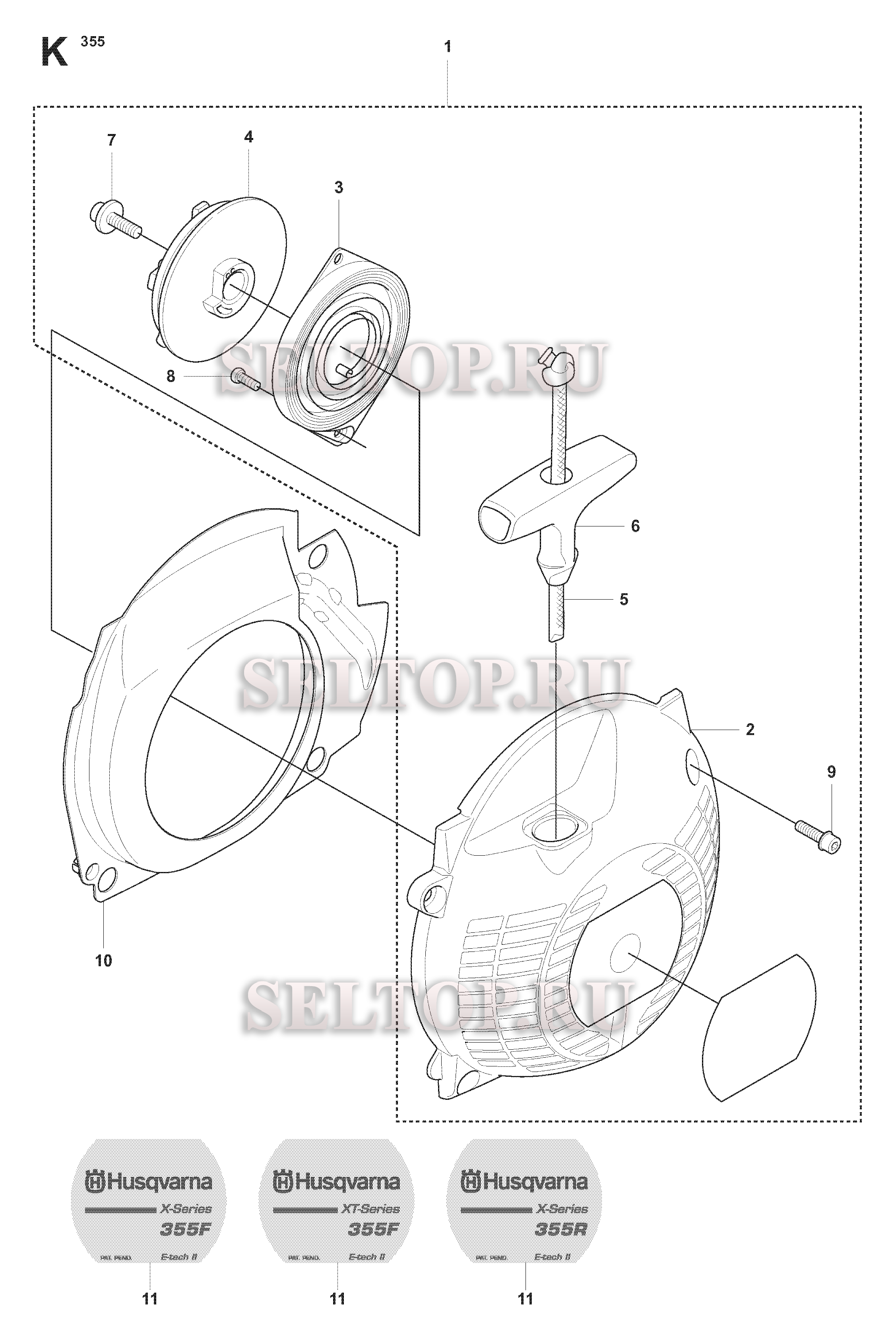 Стартер для триммера Husqvarna 355 RX (c 2007-08), взрыв-схема: