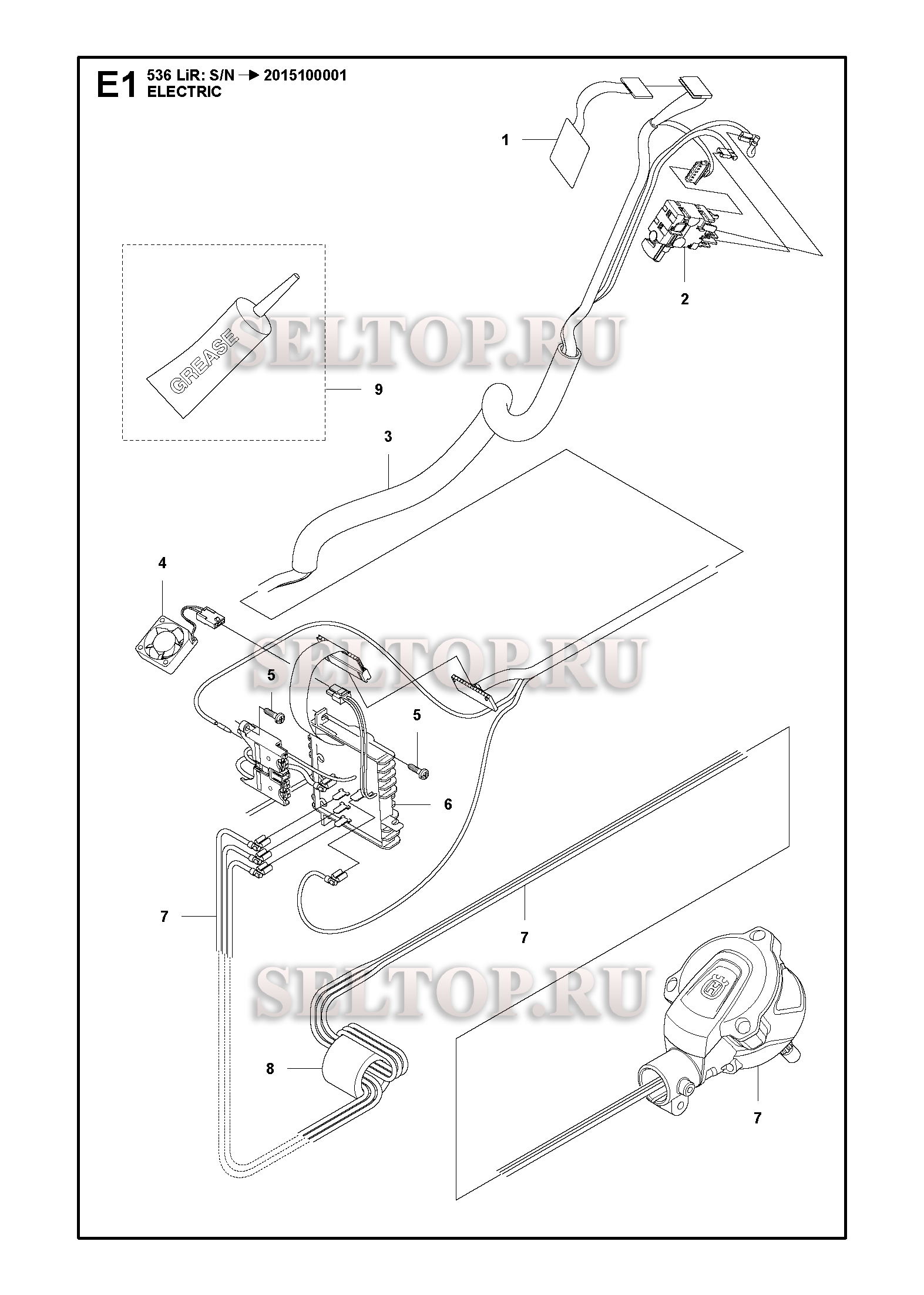 Электротехника для триммера Husqvarna 536 LiR, взрыв-схема: