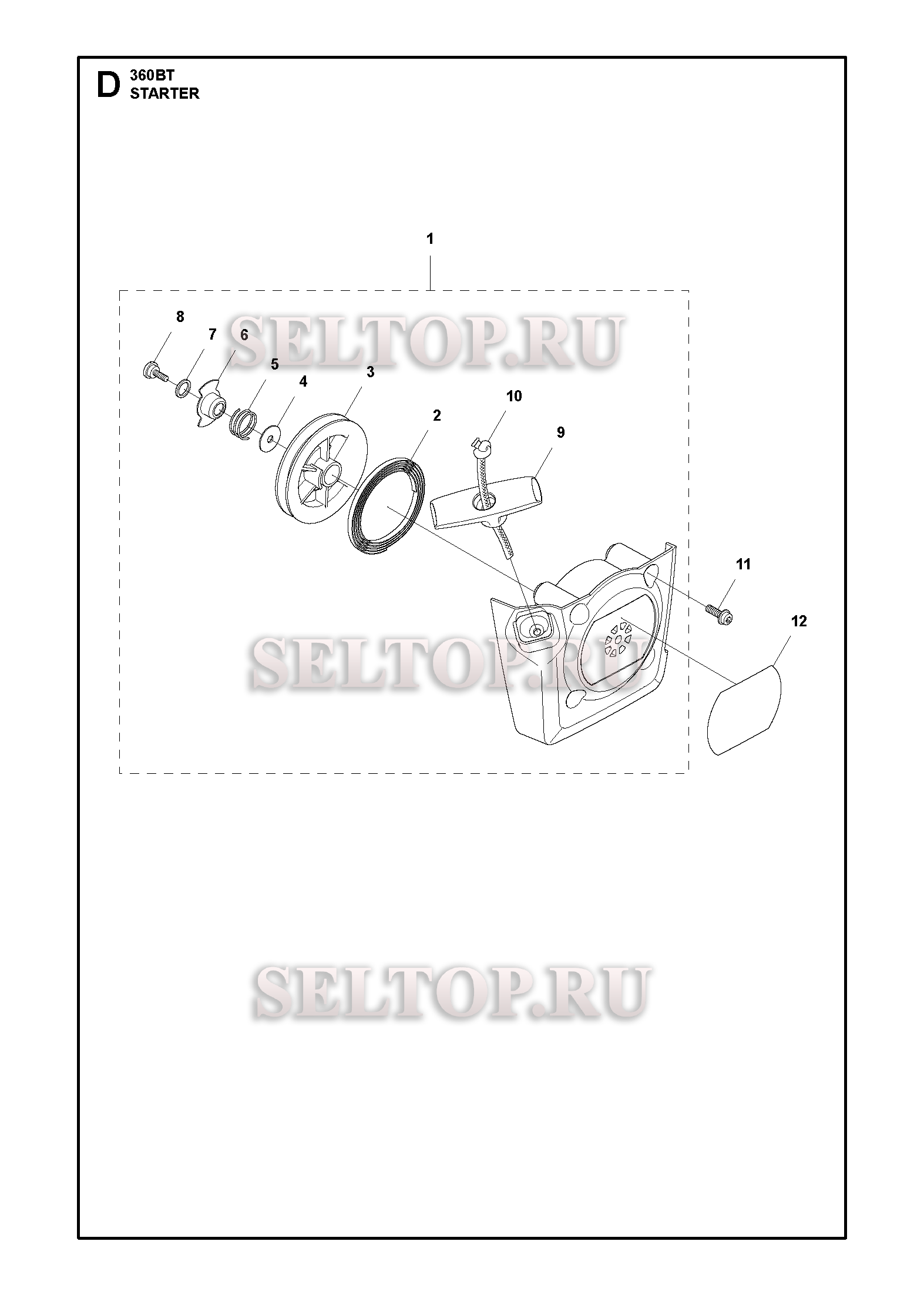 Стартер для воздуходувки Husqvarna 360 BT, взрыв-схема: