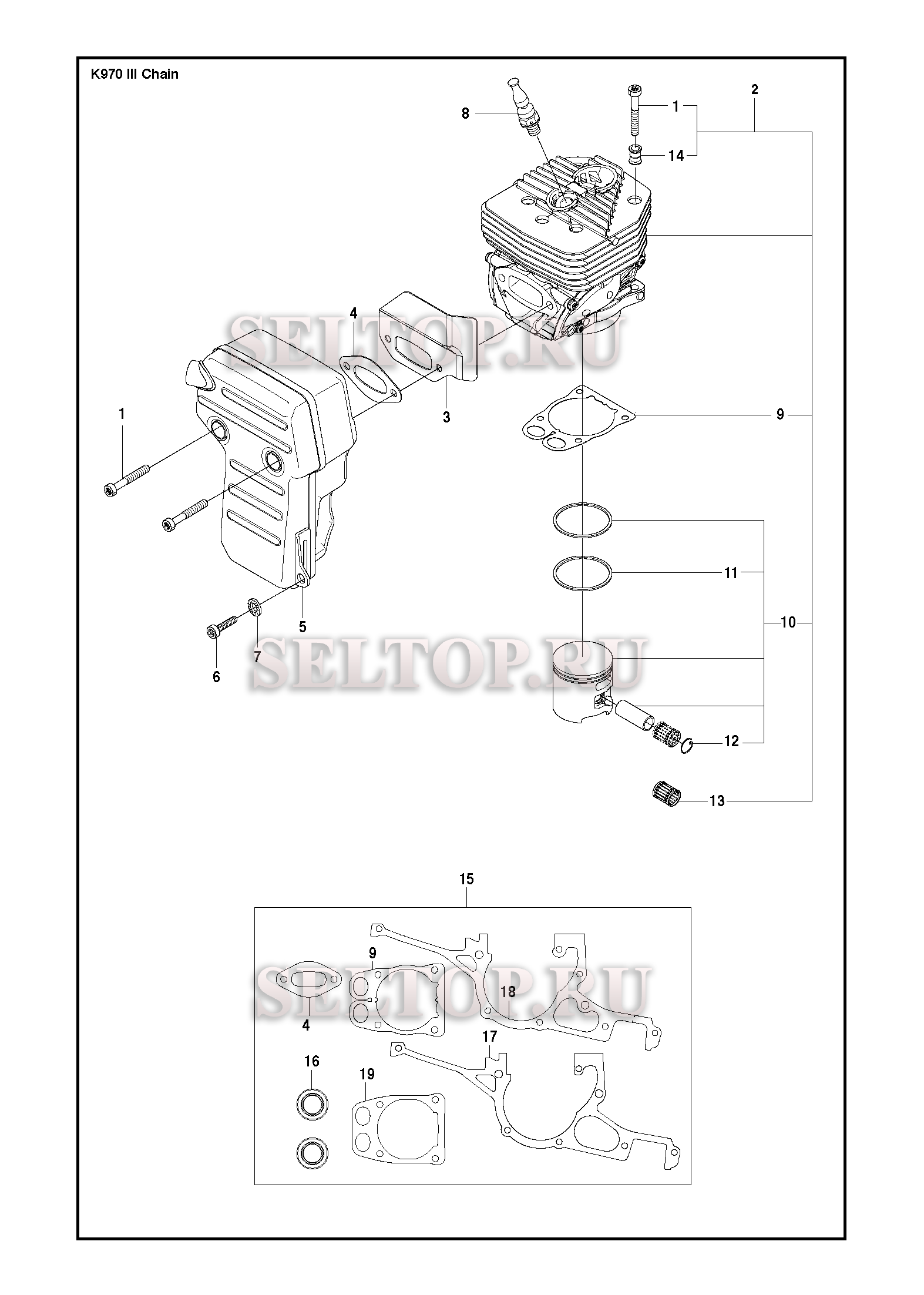 Цилиндр,поршень и глушитель для резчика Husqvarna K970 III CHAIN (с 2017-03), взрыв-схема: