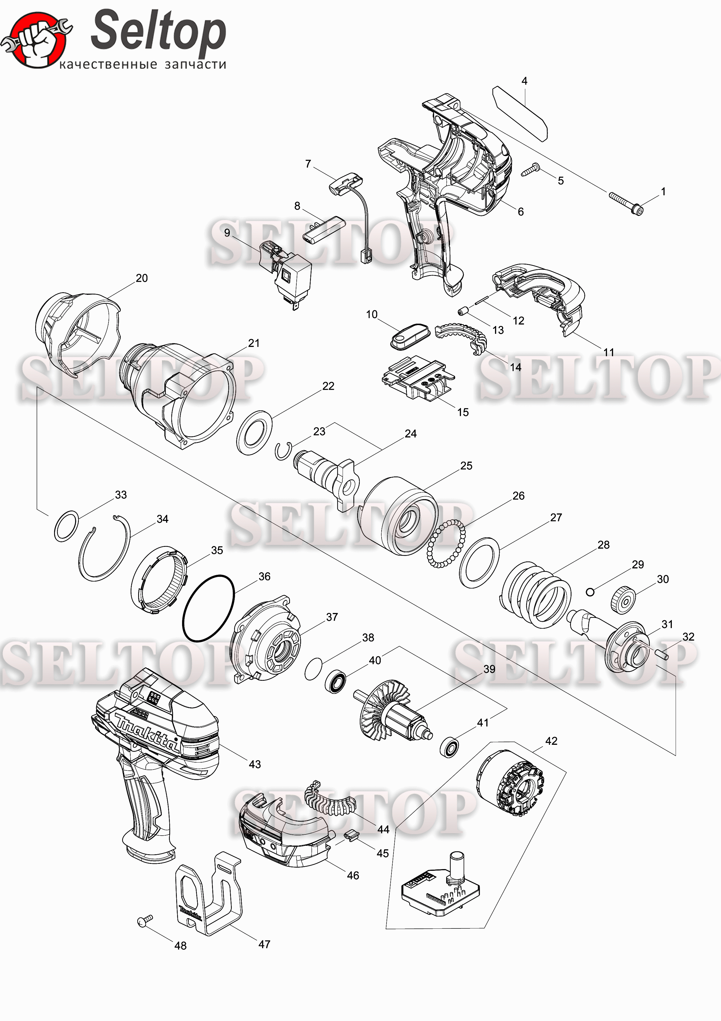 Запчасти для аккумуляторного гайковерта Макита DTW 1001, взрыв-схема:
