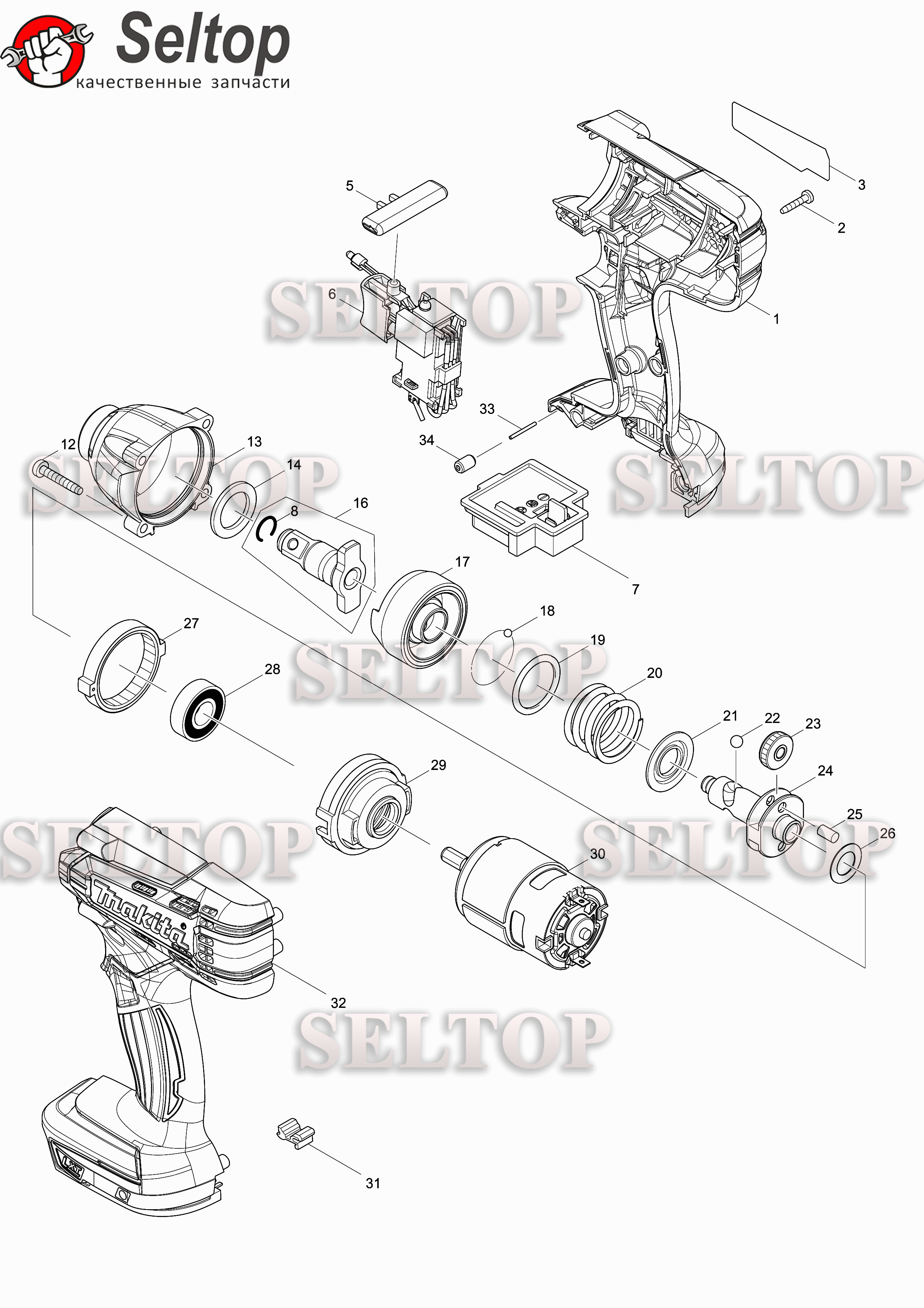 Запчасти для аккумуляторного гайковерта Макита DTW 190, взрыв-схема:
