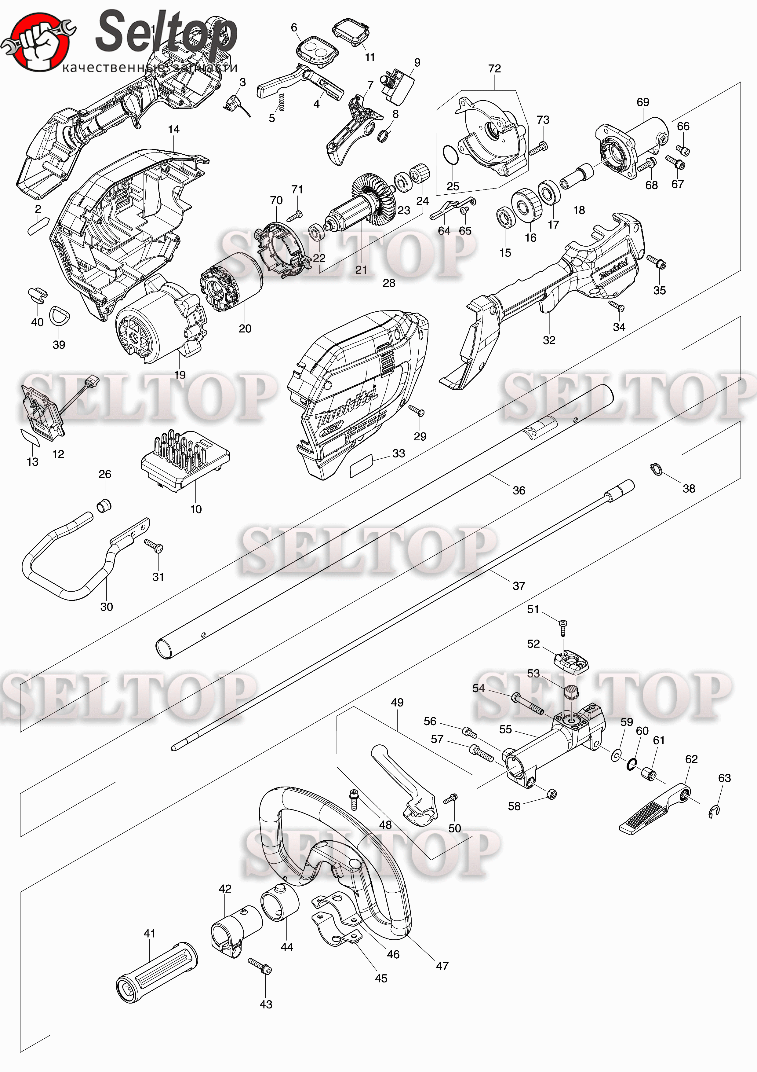 Запчасти для аккумуляторного комбимотора Makita UX 01 G, взрыв-схема: