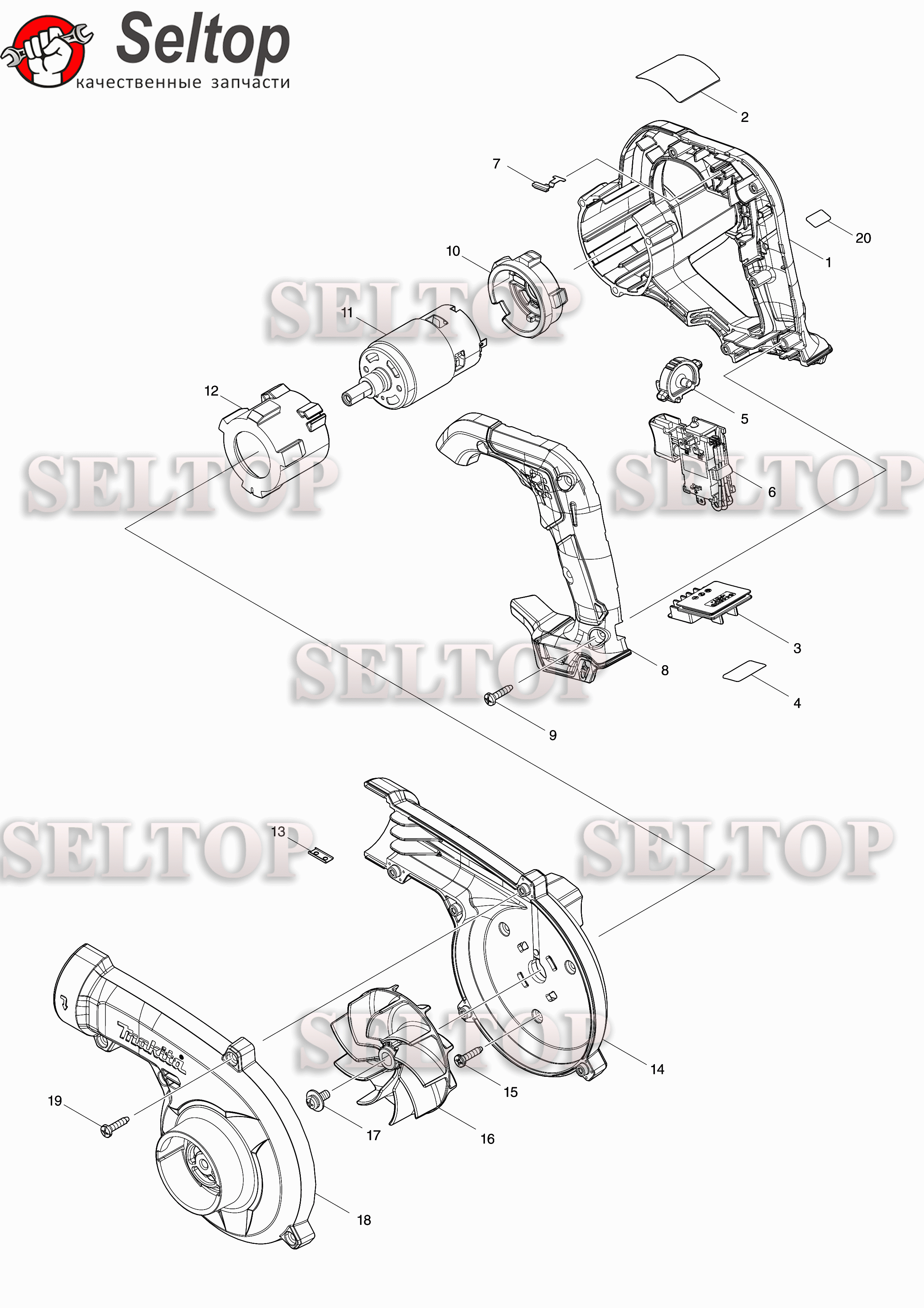 Запчасти для аккумуляторной воздуходувки Макита UB 100 DZ, взрыв-схема: