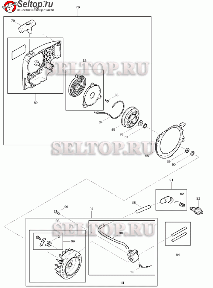 Стартер, система зажигания для Makita DCS 4300I, взрыв-схема: