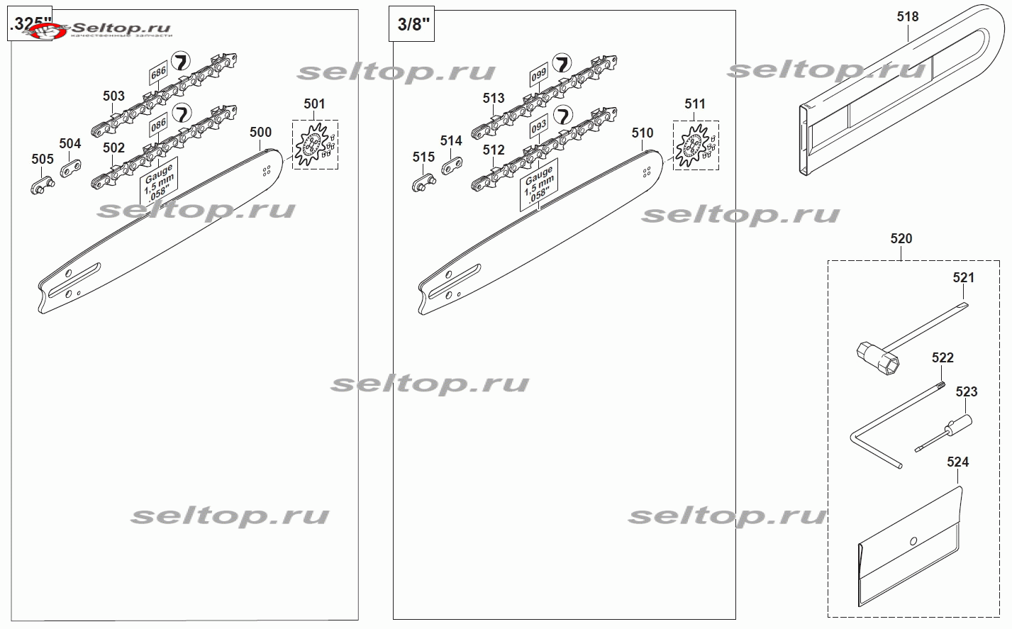 Шина, цепь, инструмент, чехол шины для бензопилы DCS 500, взрыв-схема: