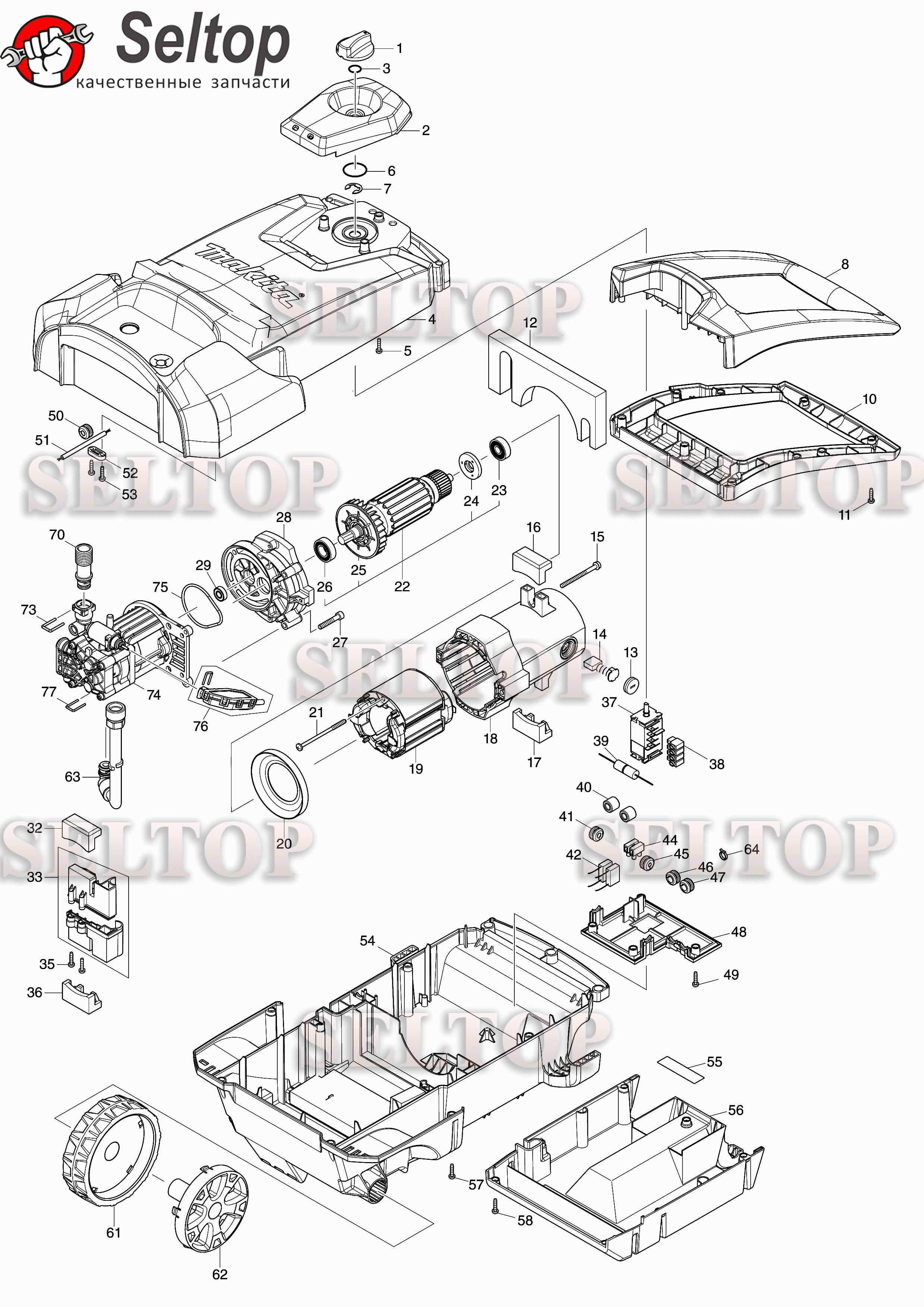 Корпус, двигатель для Makita HW 1200, взрыв-схема: