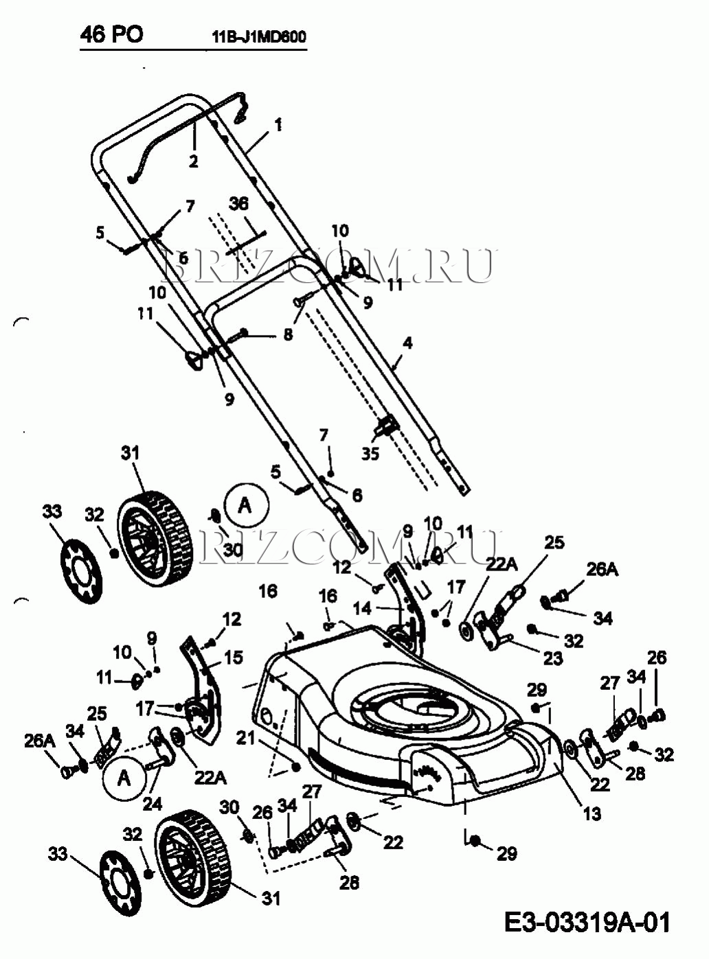 Ручка, колеса, регулятор высоты реза МТД 46 PO 11B-J1MD600 (2007), взрыв-схема: