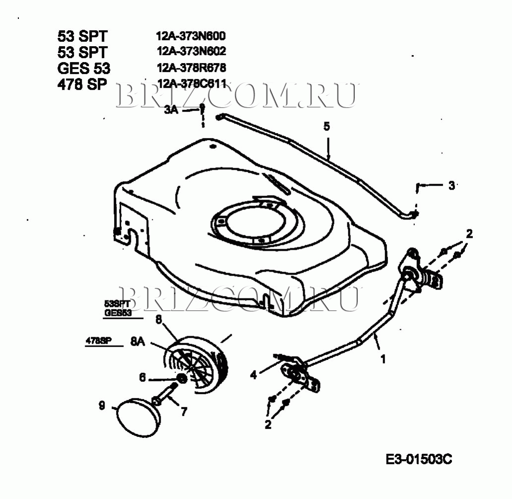 Переднее колесо, центральная стойка МТД 53 SPT 12A-373N600 (2003), взрыв-схема: