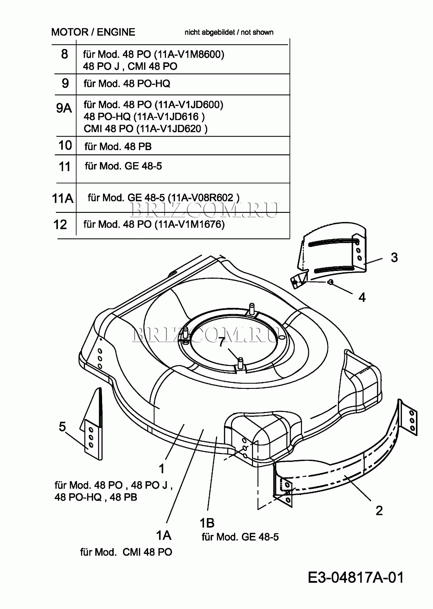 Корпус деки, двигатель МТД GE 48-5 11A-V08R602 (2010), взрыв-схема: