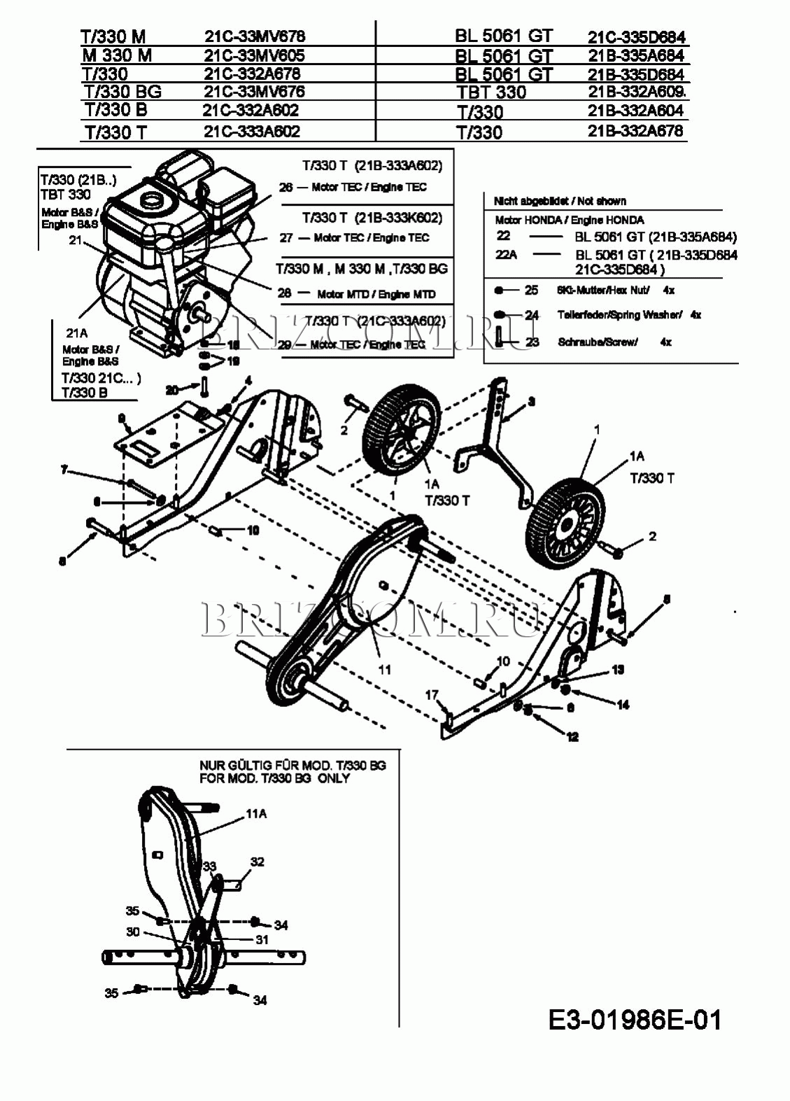 Фрезы культиватора, двигатель, колеса МТД T/330 M 21C-33MV678 (2010), взрыв-схема: