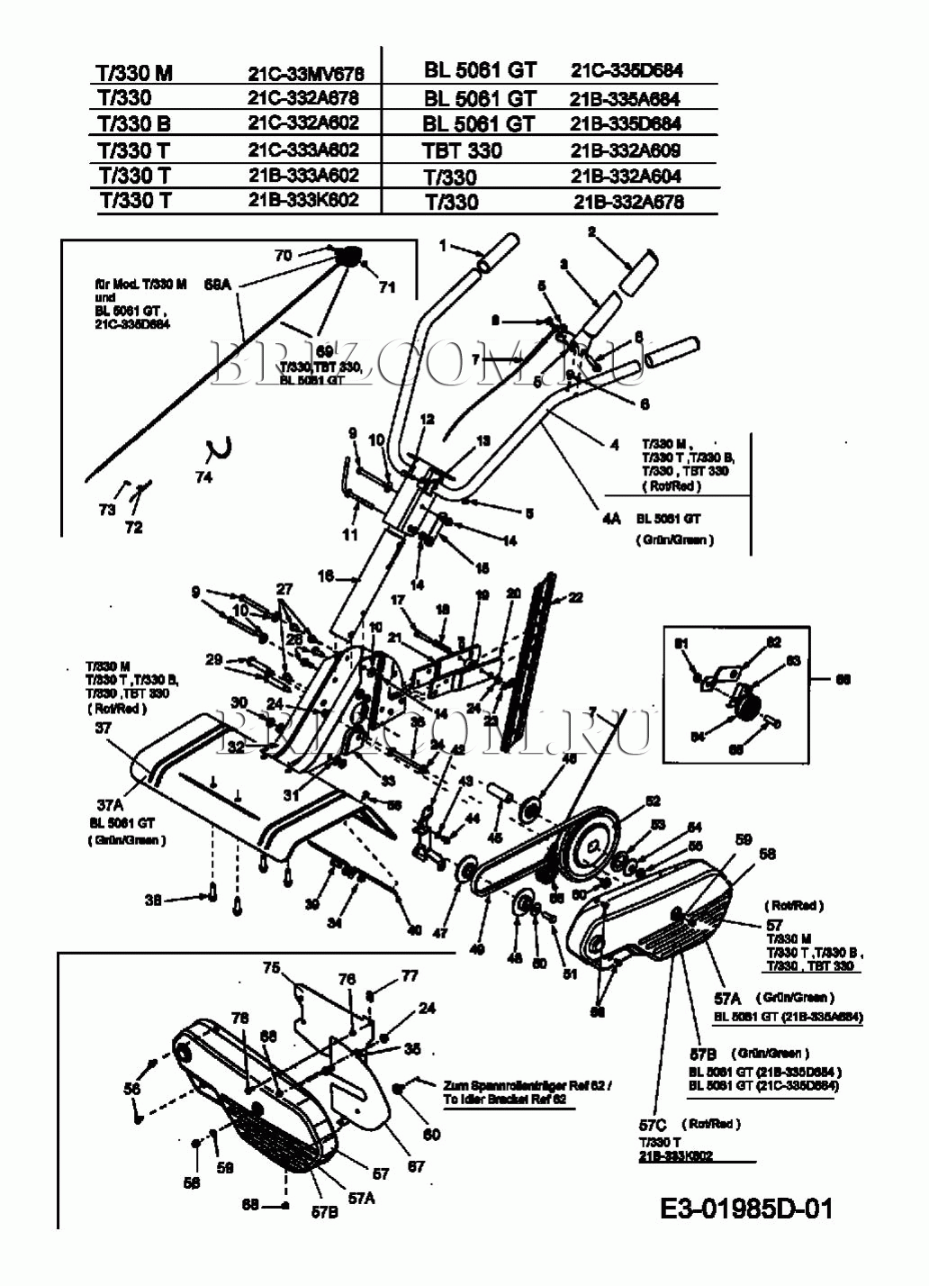Система привода фрез культиватора, ручка МТД T/330 M 21C-33MV678 (2008), взрыв-схема: