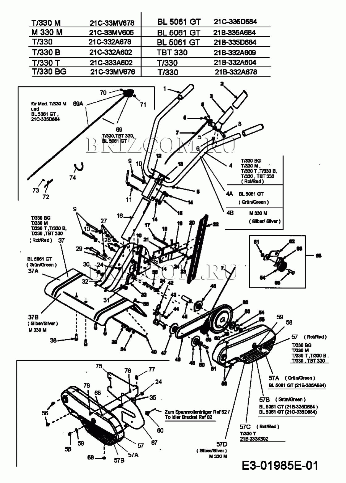 Система привода фрез культиватора, ручка МТД T/330 M 21C-33MV678 (2009), взрыв-схема: