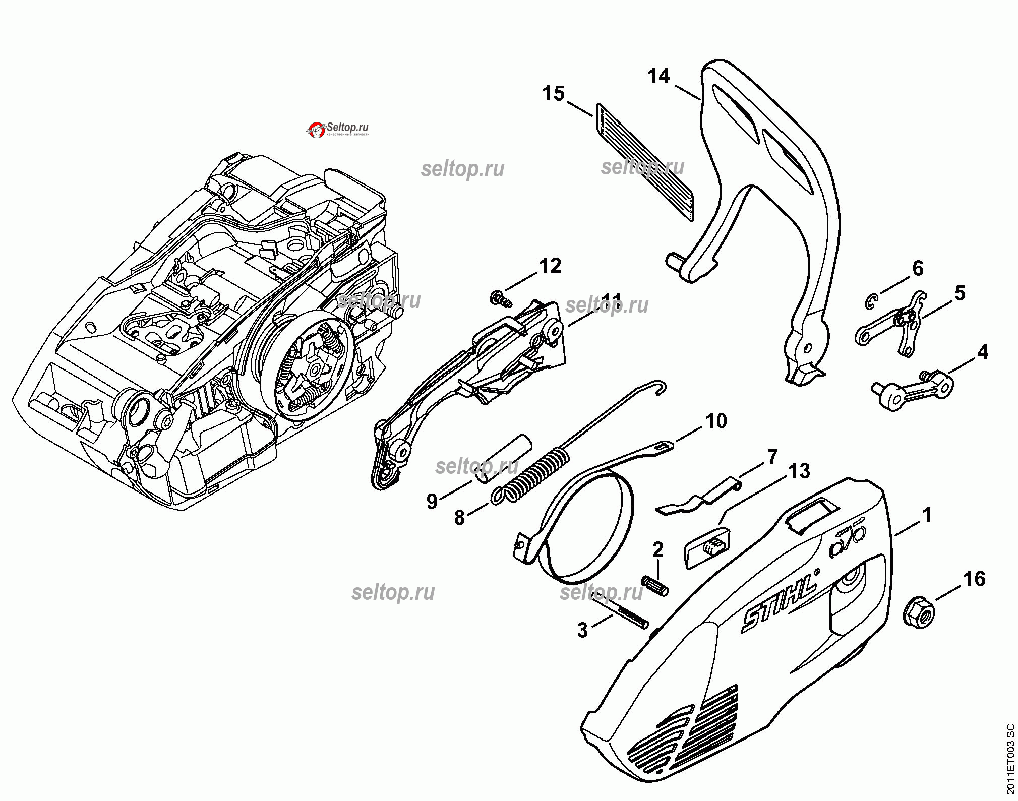 Крышка цепной звёздочки для бензопилы Stihl MS 150 C, взрыв-схема: