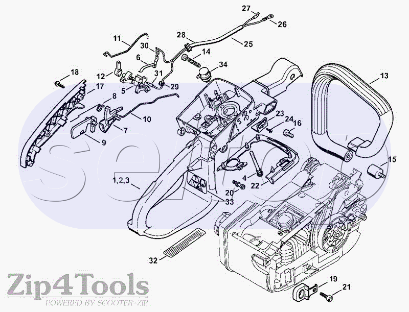 Корпус рукоятки STIHL MS 200, взрыв-схема: