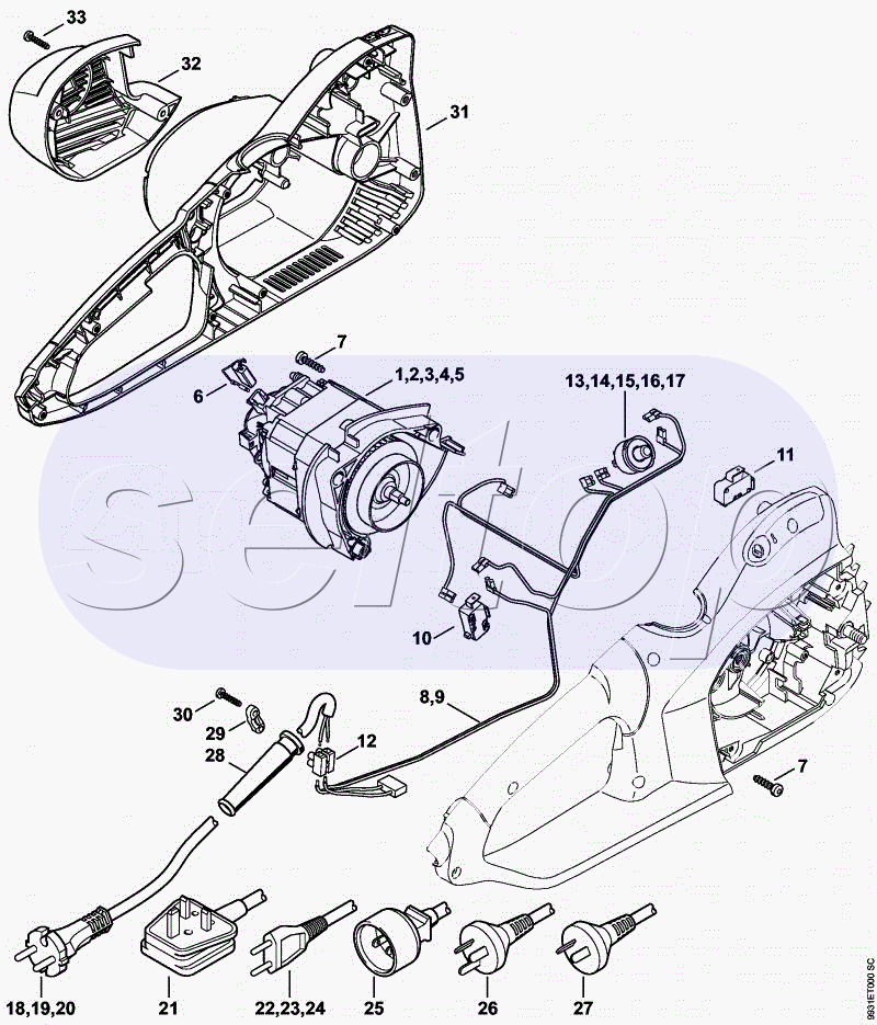 MSE 170 C, 190 C, 210 C: Электродвигатель. Картер двигателя STIHL MSE 210C, взрыв-схема: