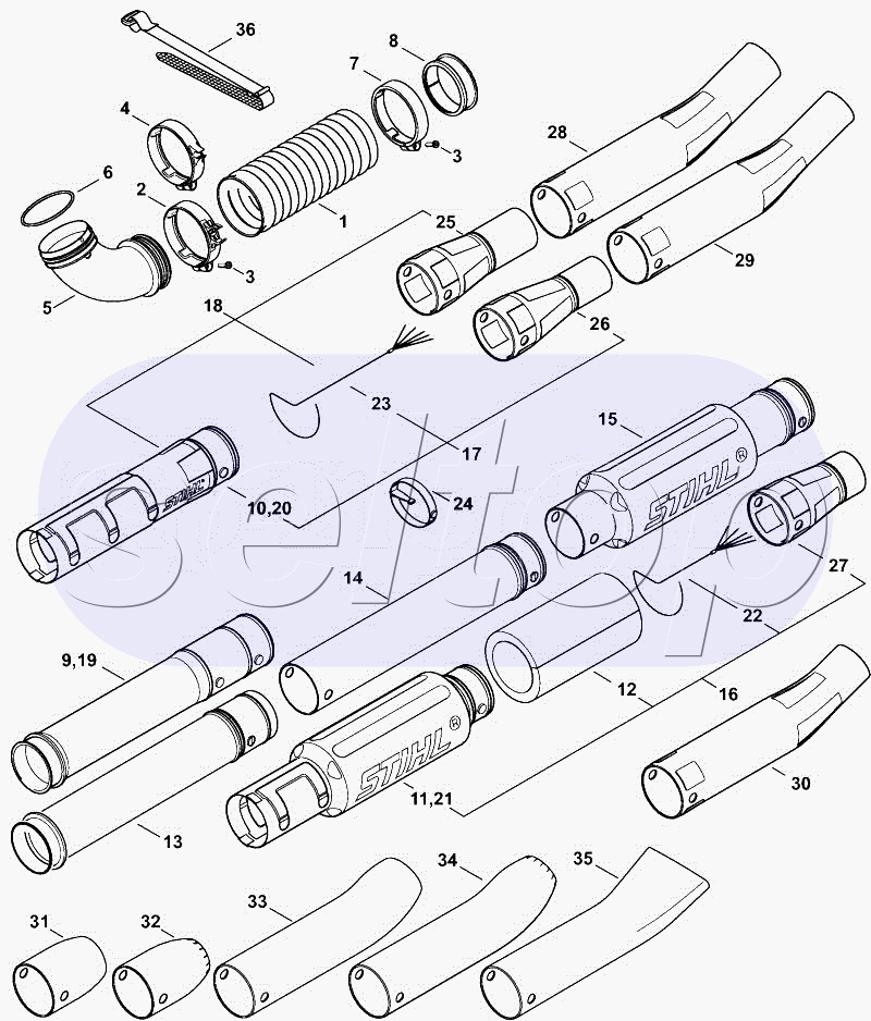 Гофрированный шланг, пневматическая труба STIHL BR 600, взрыв-схема: