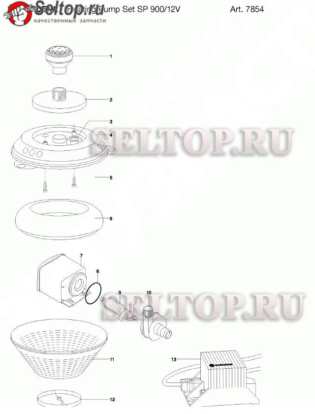 Запчасти для фонтанного насоса Gardena sp 900 12v (до 2007 года) (артикул 7854-20), взрыв-схема: