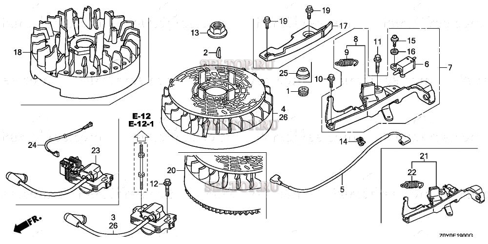Маховик, катушка зажигания (алюминий) для Honda GCV190A R1A, взрыв-схема: