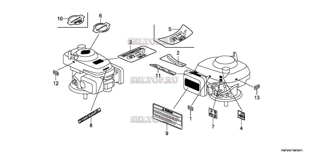 Этикетка для Honda GCV190LA SBA, взрыв-схема: