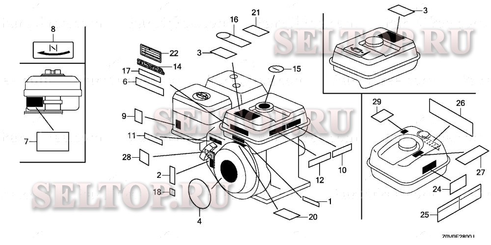 Этикетка для Honda GX200T SM12, взрыв-схема:
