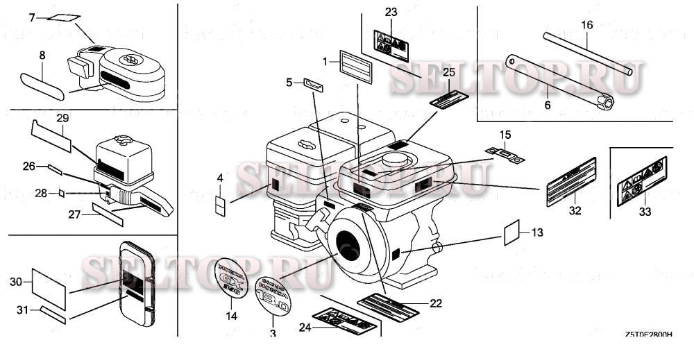 Этикетка для Honda GX390UT2 QWT2, взрыв-схема: