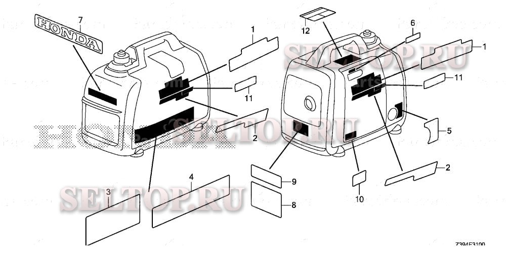 Этикетка для Honda EU2000IT1 A3, взрыв-схема: