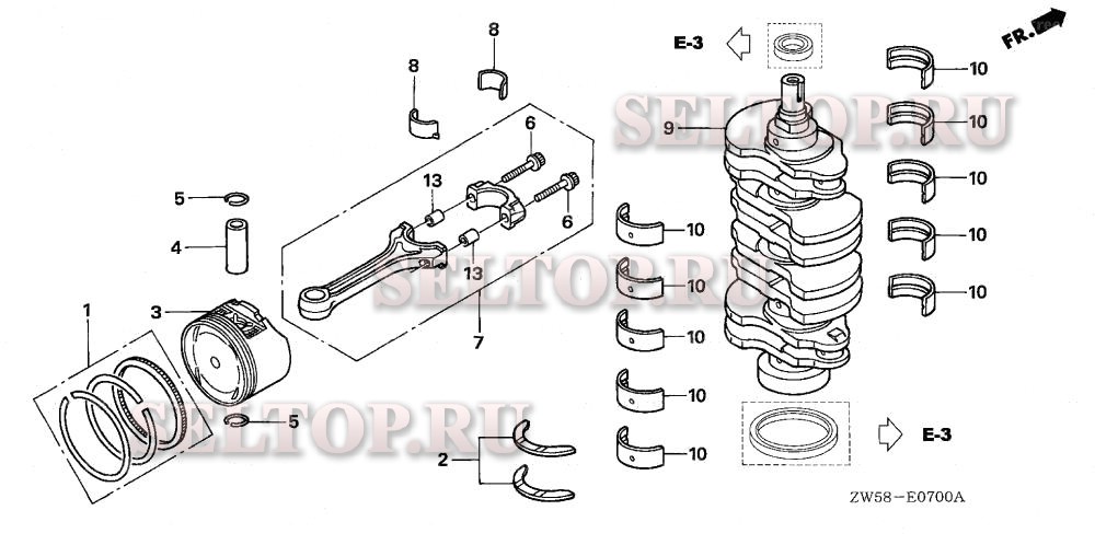 Коленвал, поршень для Honda BF130A4 XCA, взрыв-схема: