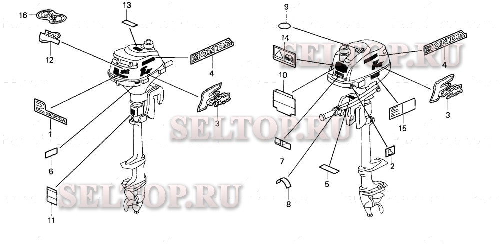 Этикетки для Honda BF2D5 SHA, взрыв-схема: