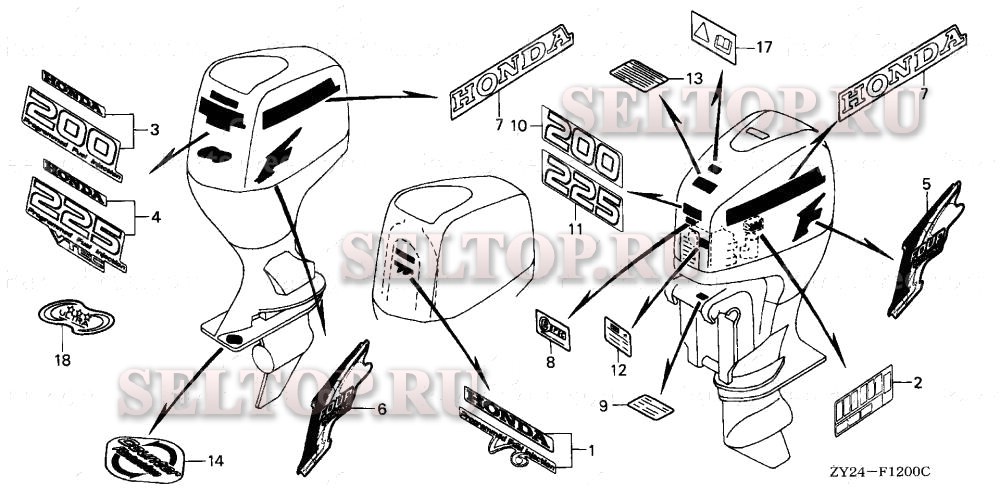Этикетки для Honda BF225A2 XXA, взрыв-схема:
