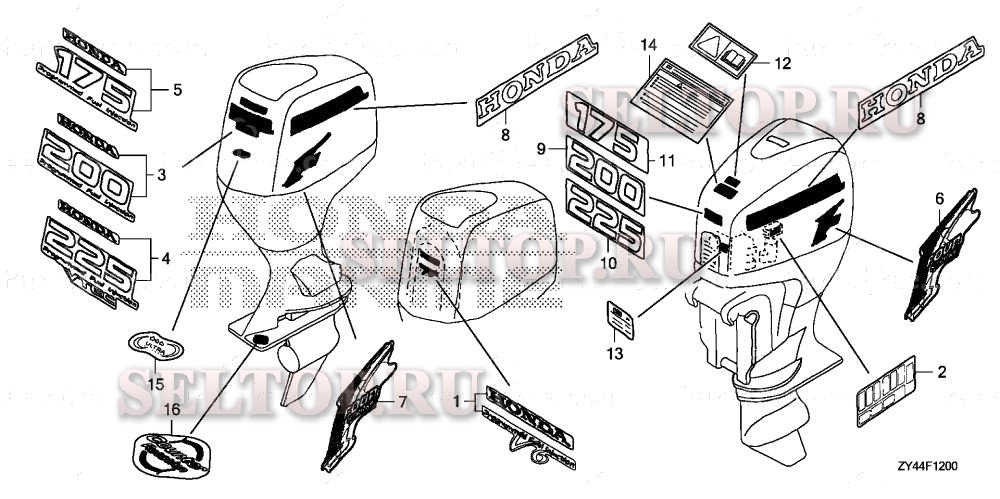 Этикетка для Honda BF225AK1 XXCA, взрыв-схема: