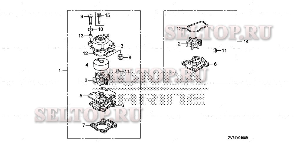 Крыльчатка насоса для Honda BF30D4 LRGA, взрыв-схема: