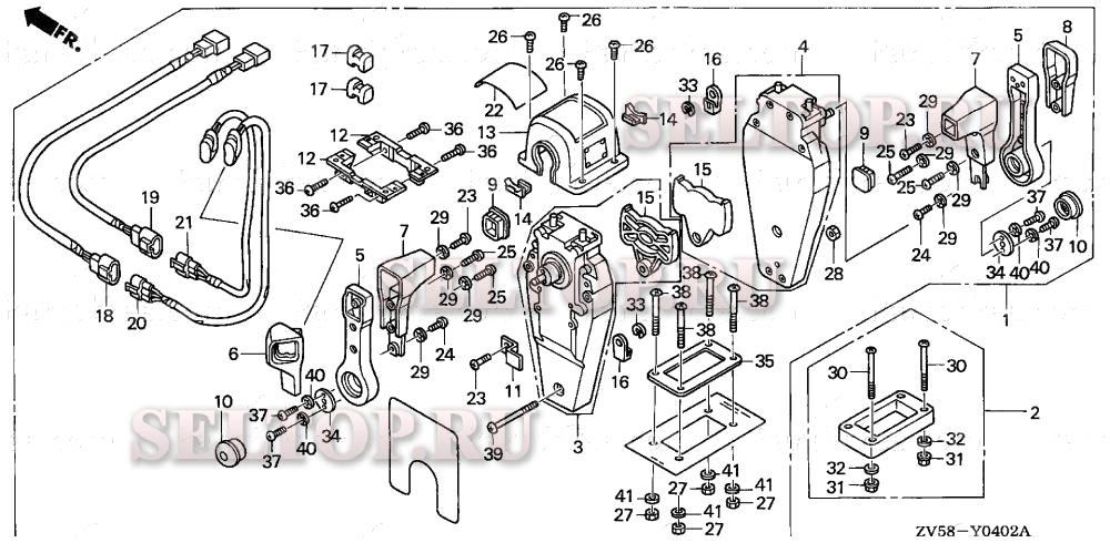 Дистанционное управление (верхняя опора двутипная) (правая) для Honda BF40A1 LRA, взрыв-схема: