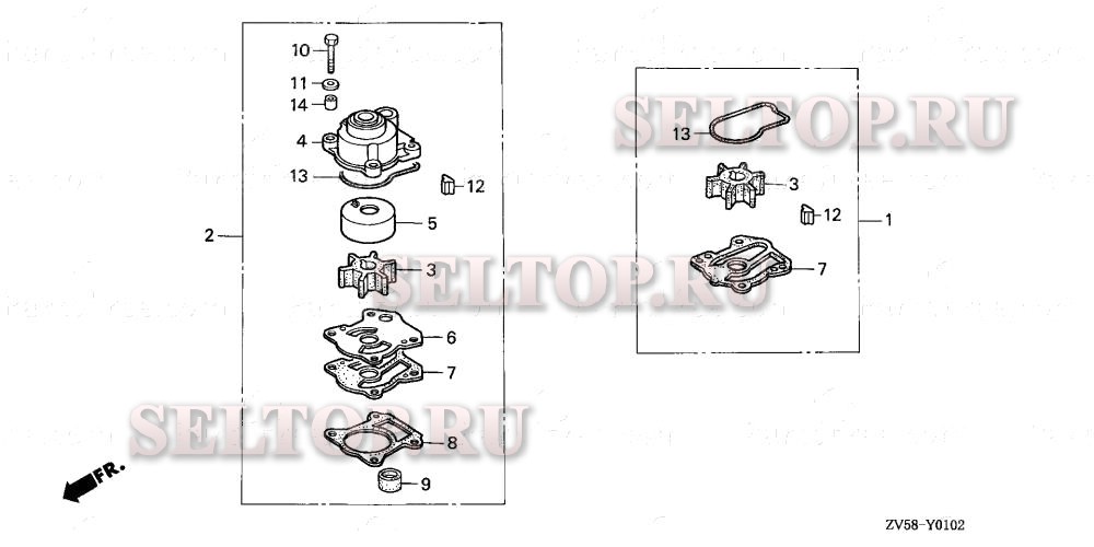Комплект крыльчатки насоса для Honda BF40A3 LHTA, взрыв-схема: