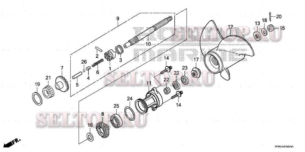 Карданный вал для Honda BF40DK2 LRTA, взрыв-схема: