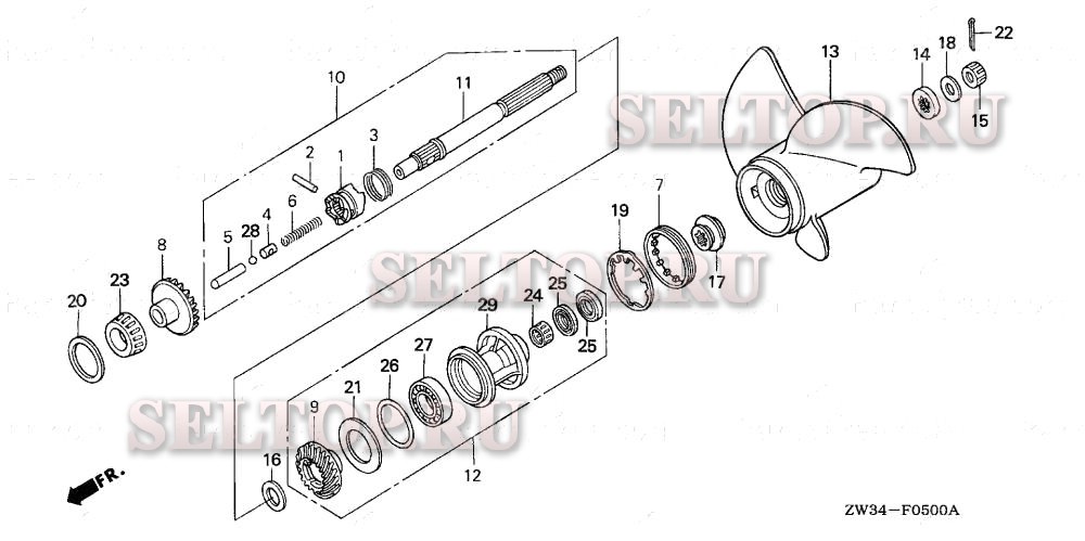Гребной винт, карданный вал для Honda BF50A5 LHTA, взрыв-схема: