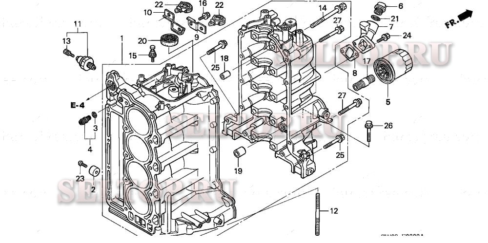 Блок цилиндров для Honda BF90A2 LRTA, взрыв-схема: