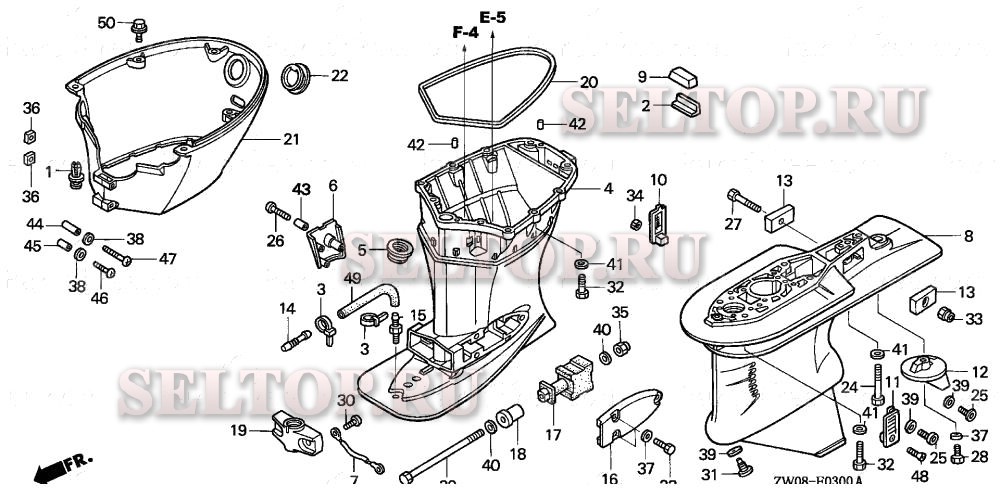 Корпус редуктора, выступающая часть для Honda BF90A4 JHTA, взрыв-схема: