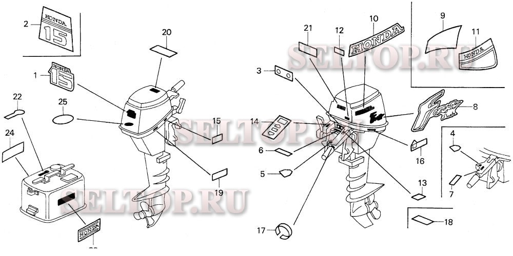 Этикетки для Honda BF9.9AM XA, взрыв-схема:
