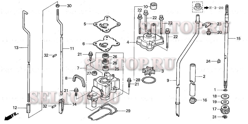 Водяной насос, вертикальный вал (ul size) для Honda BFP9.9D1 XHA, взрыв-схема: