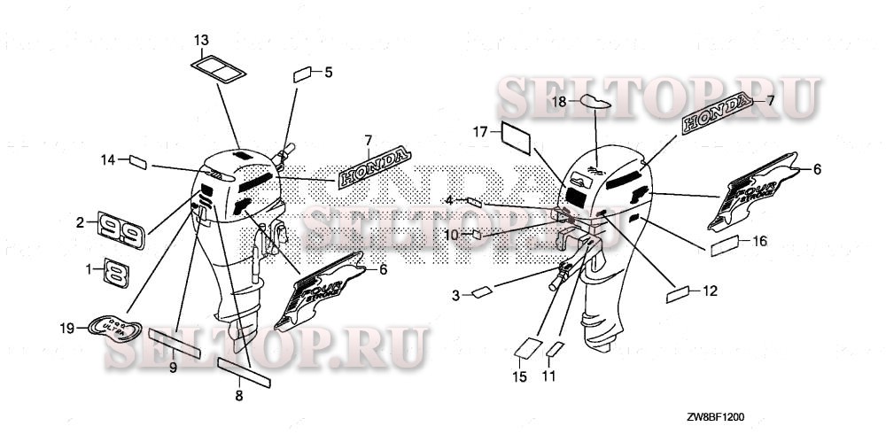 Этикетки для Honda BFP9.9DK0 LRA, взрыв-схема:
