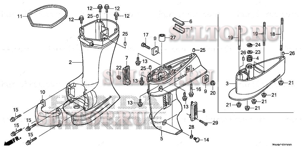 Корпус редуктора, выступающая часть для Honda BFP9.9DK3 XHTA, взрыв-схема: